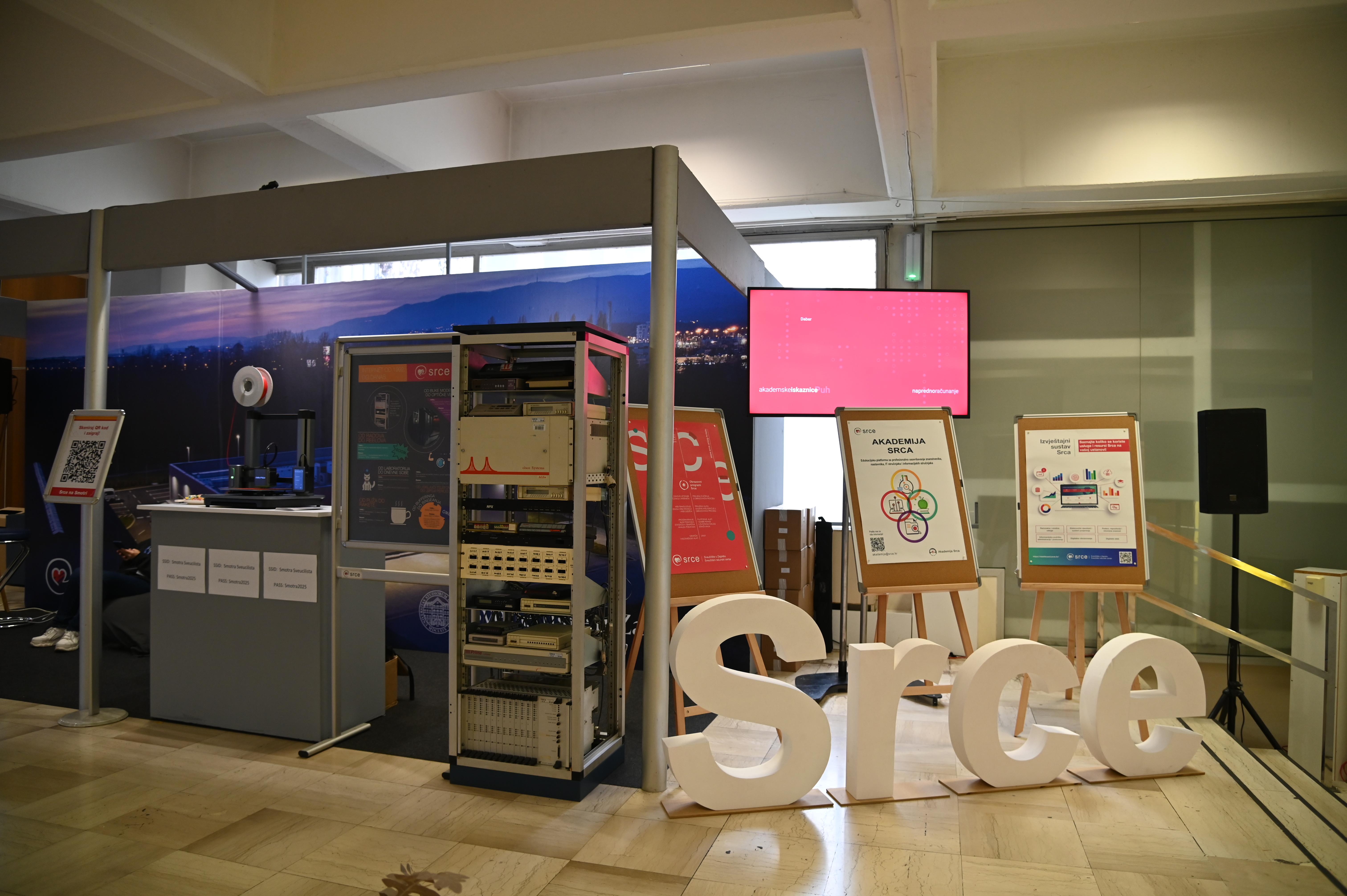 Srce se predstavilo bogato opremljenim izložbenim prostorom, na kojem su stručnjaci posjetiteljima približili digitalne usluge i sustave koji studentima pomažu tijekom cijelog studija – od upisa do završetka obrazovanja. U sklopu Smotre održano je i predstavljanje „Digitalni oslonac kroz studentski put: podrška Sveučilišnog računskog centra“, u kojem su predstavljene ključne digitalne usluge i infrastruktura Srca za akademsku zajednicu.